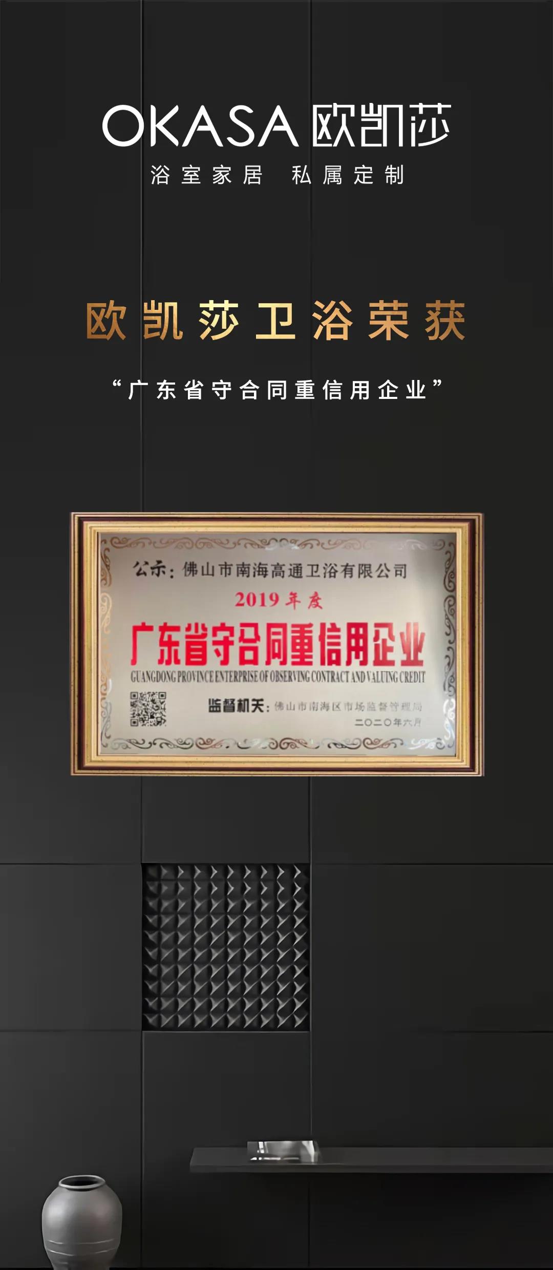 歐凱莎衛(wèi)浴榮獲 “廣東省守合同重信用” 企業(yè)稱號