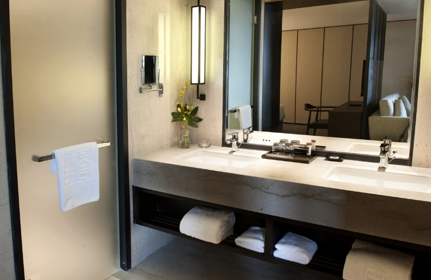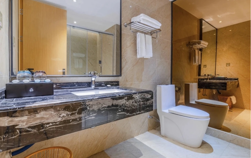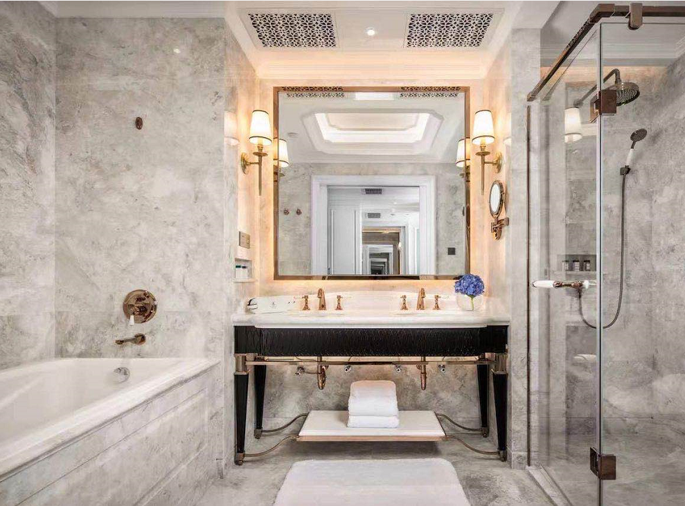美式精工手工銅制燈飾與土耳其進(jìn)口石材營造出柔和、自然、典雅、浪漫的氛圍。全智能沖洗馬桶、高速無線上網(wǎng),酒店豪華標(biāo)準(zhǔn)間更有雙衣柜、雙面盆等貼心設(shè)計(jì)。
