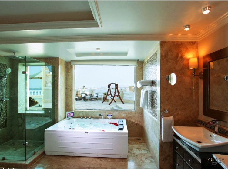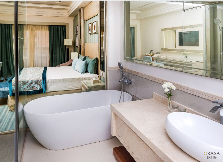 酒店衛(wèi)浴空間設(shè)計風(fēng)格與整個酒店調(diào)性一致,獨立淋浴房,寬敞浴缸,高級簡約浴室柜,整套齊全,風(fēng)格協(xié)調(diào),浪漫又不失氣派,別有一番體驗。