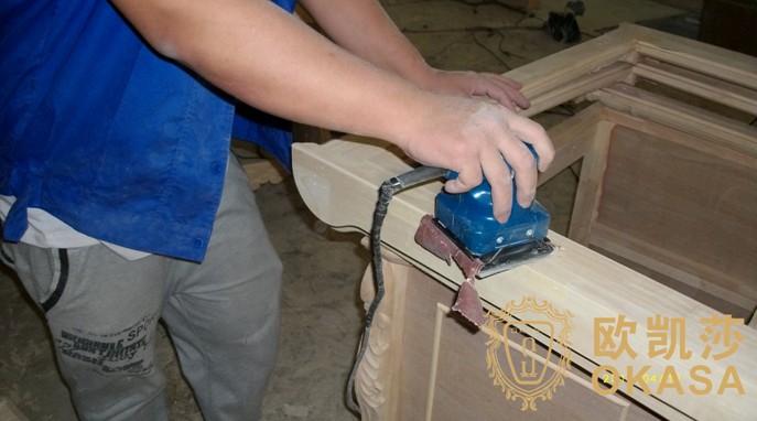 開料、打磨、拼裝這些都屬于生產(chǎn)流程的第一大部分,接下來這開始生產(chǎn)流程的第二大部分。柜體刷完底油就要拿到打磨師傅那邊進(jìn)行新一輪打磨,打磨完就要再一次刷底油,刷完底油就再去打磨,然后上膩?zhàn)印?br /> 這樣反反復(fù)復(fù)刷底油、打磨、修補(bǔ),最終呈現(xiàn)的效果是板材光滑平整,厚薄均勻,下一道噴漆工序的時候更好噴。消費(fèi)者也許會擔(dān)心平時浴室濕氣大,歐式浴室柜會容易受潮變形。車間老師傅認(rèn)為,浴室柜要抵抗浴室濕氣,油漆保護(hù)層要做足功夫,歐凱莎衛(wèi)浴浴室柜板材表面經(jīng)過7層油漆打磨處理,這樣生產(chǎn)出來的浴室柜能有效抵擋濕氣的侵蝕。